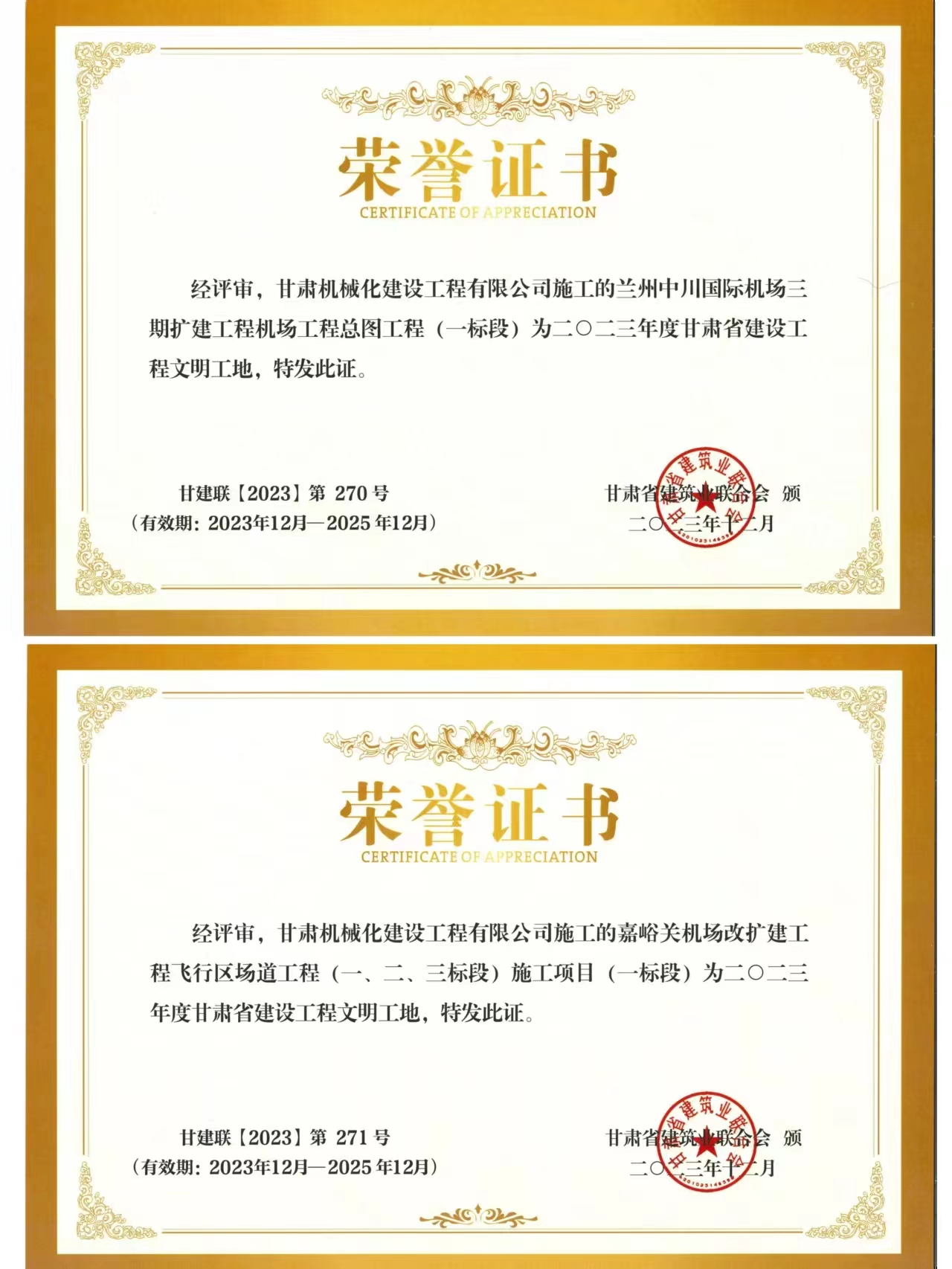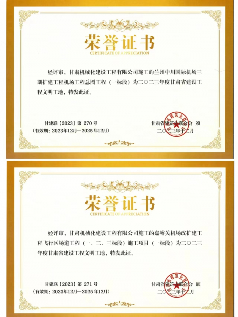 近日,我司承建的蘭州中川國際機(jī)場二期擴(kuò)建工程機(jī)場工程總圖工程 (一標(biāo)段)與嘉峪關(guān)機(jī)場改擴(kuò)建工飛行區(qū)場道(一、二、三標(biāo)段) 施工項(xiàng)目 (一標(biāo)段) 獲得2023年度甘肅省建設(shè)工程文明工地榮譽(yù)稱號(hào)。