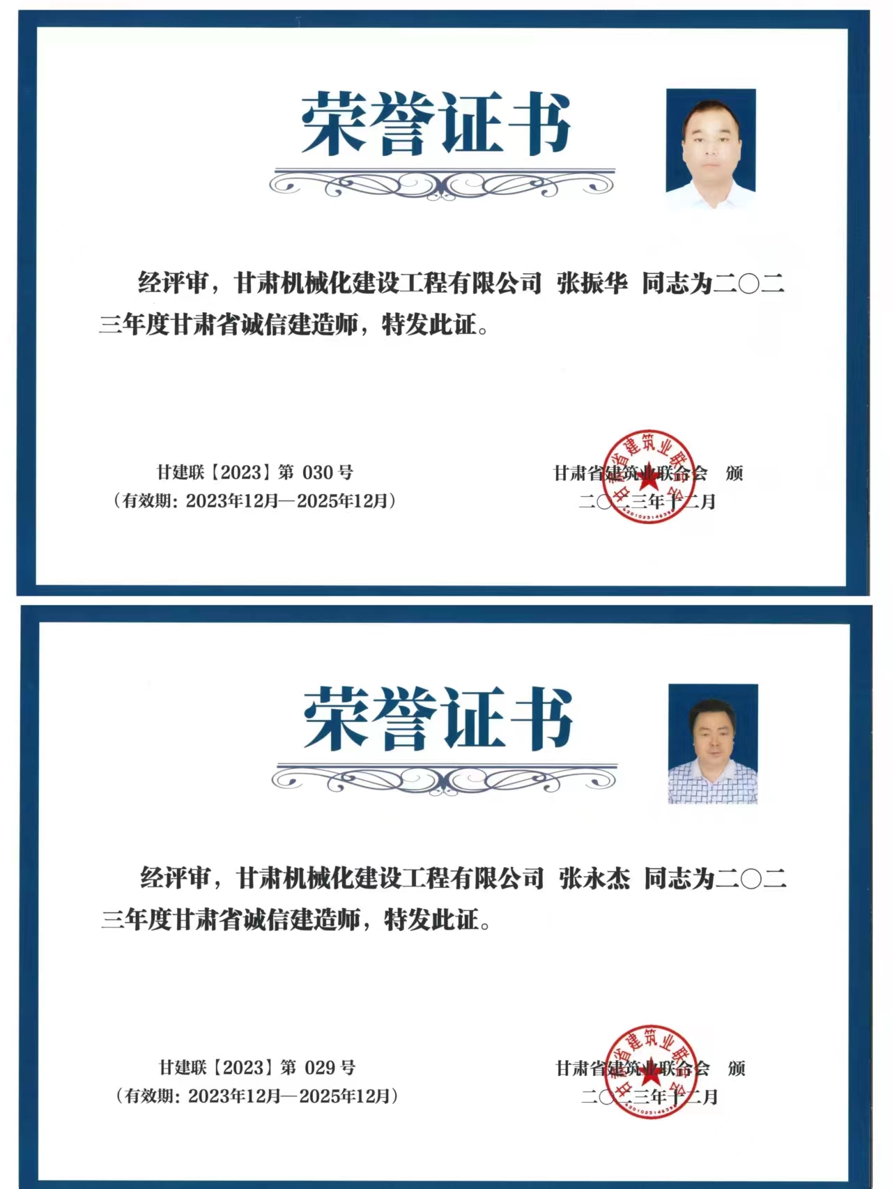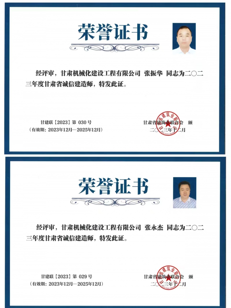 張永杰與張振華兩位同志獲得2023年度甘肅省誠信建造師榮譽(yù)稱號(hào)。
