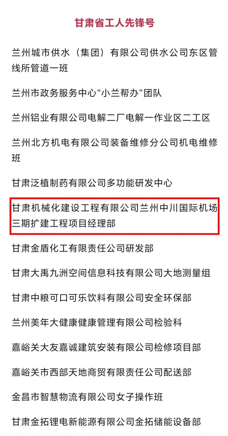 近日,甘肅省總工會(huì)發(fā)布了2024年甘肅省“五一勞動(dòng)獎(jiǎng)和甘肅省工人先鋒號(hào)”擬表彰對(duì)象的公示。我司蘭州中川國(guó)際機(jī)場(chǎng)三期擴(kuò)建工程項(xiàng)目經(jīng)理部被授予“甘肅省工人先鋒號(hào)”,該獎(jiǎng)的獲得既是對(duì)項(xiàng)目團(tuán)隊(duì)長(zhǎng)期拼搏奮斗的肯定,也是對(duì)公司“和諧共進(jìn)、追求卓越”企業(yè)精神的肯定。