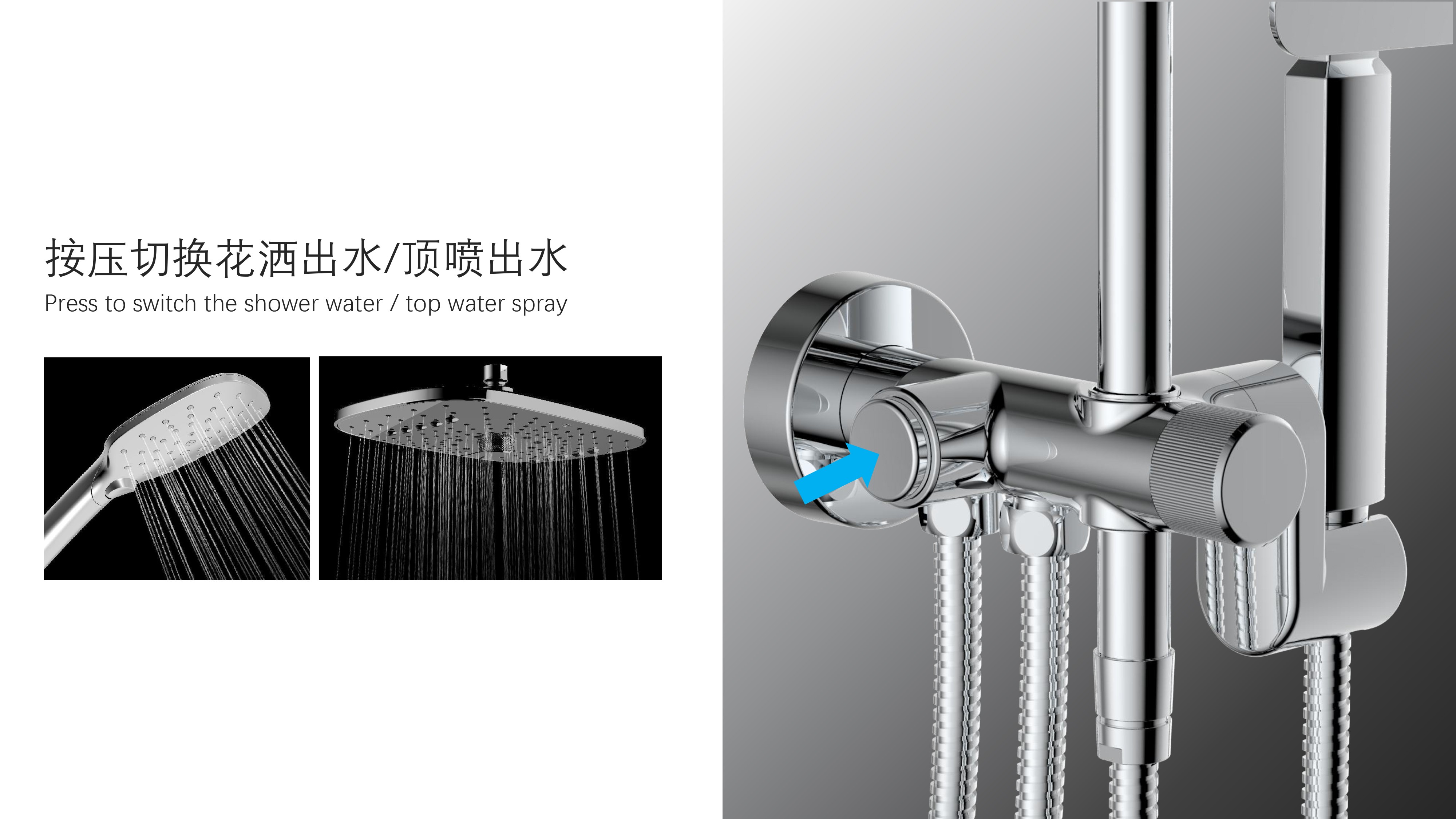 方形寬大頂噴;Z字形三通;按壓切換頂噴/花灑出水